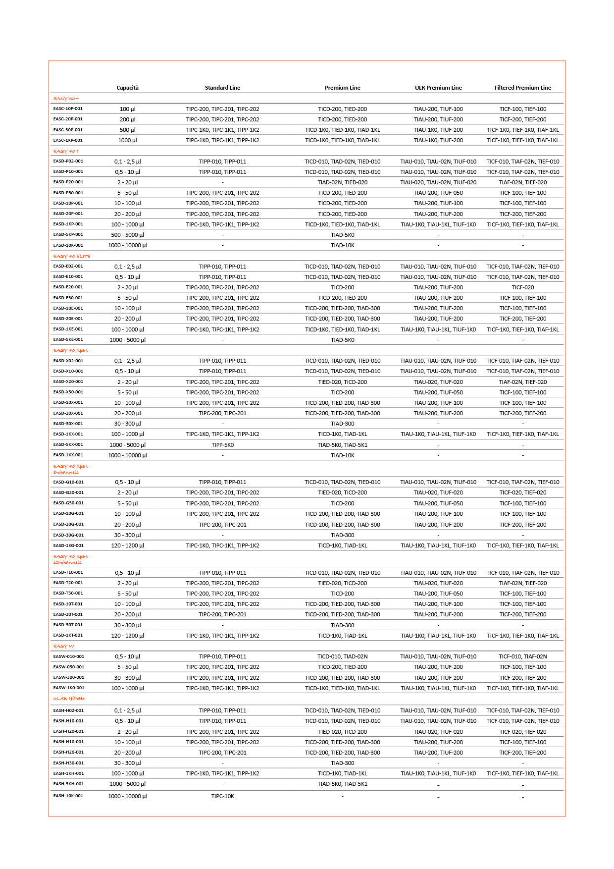 Tabella di compatibilità per puntali di pipette e puntali con filtro di Labbox comprovate con le nostre micropipette EASY. Per verificare la compatibilità dei nostri puntali con altre marche di micropipette, non esiti in sollecitare i nostri packs di mostra a Attenzione al cliente