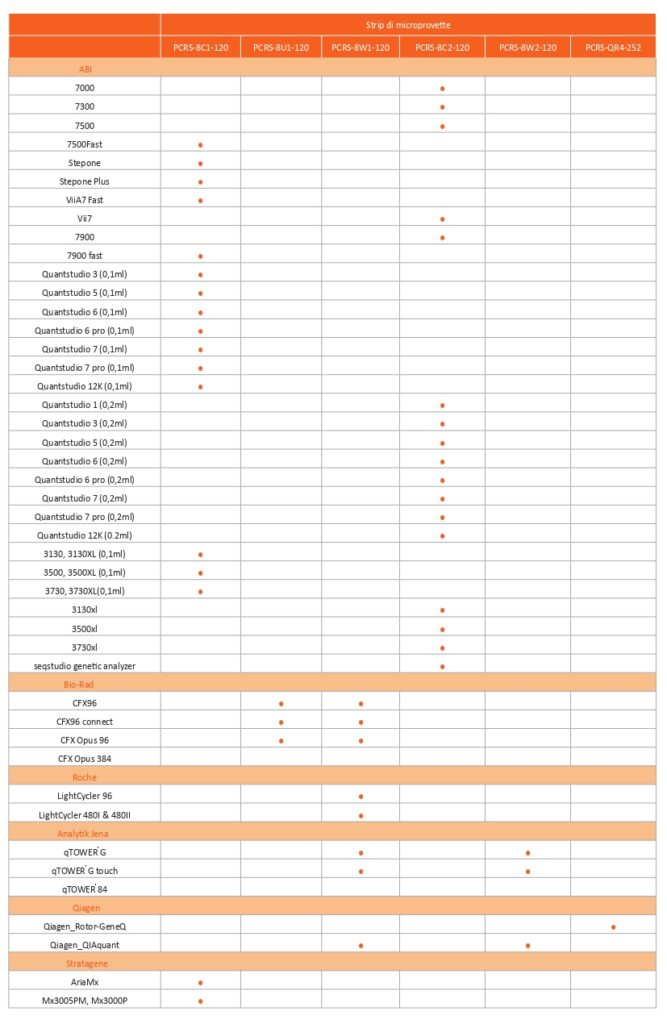 Tabella di compatibilità dei materiali di consumo astik'S per PCR / qPCR
