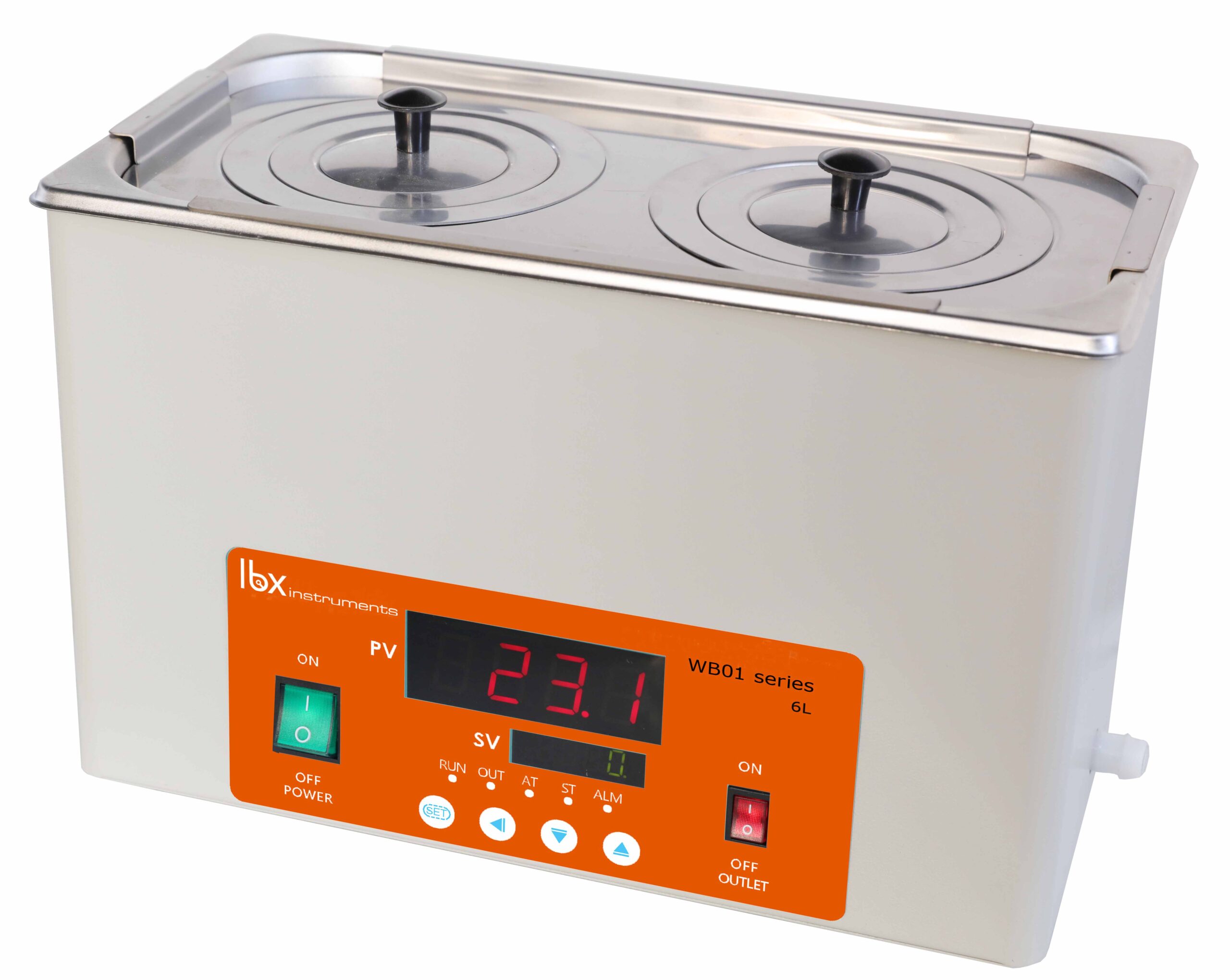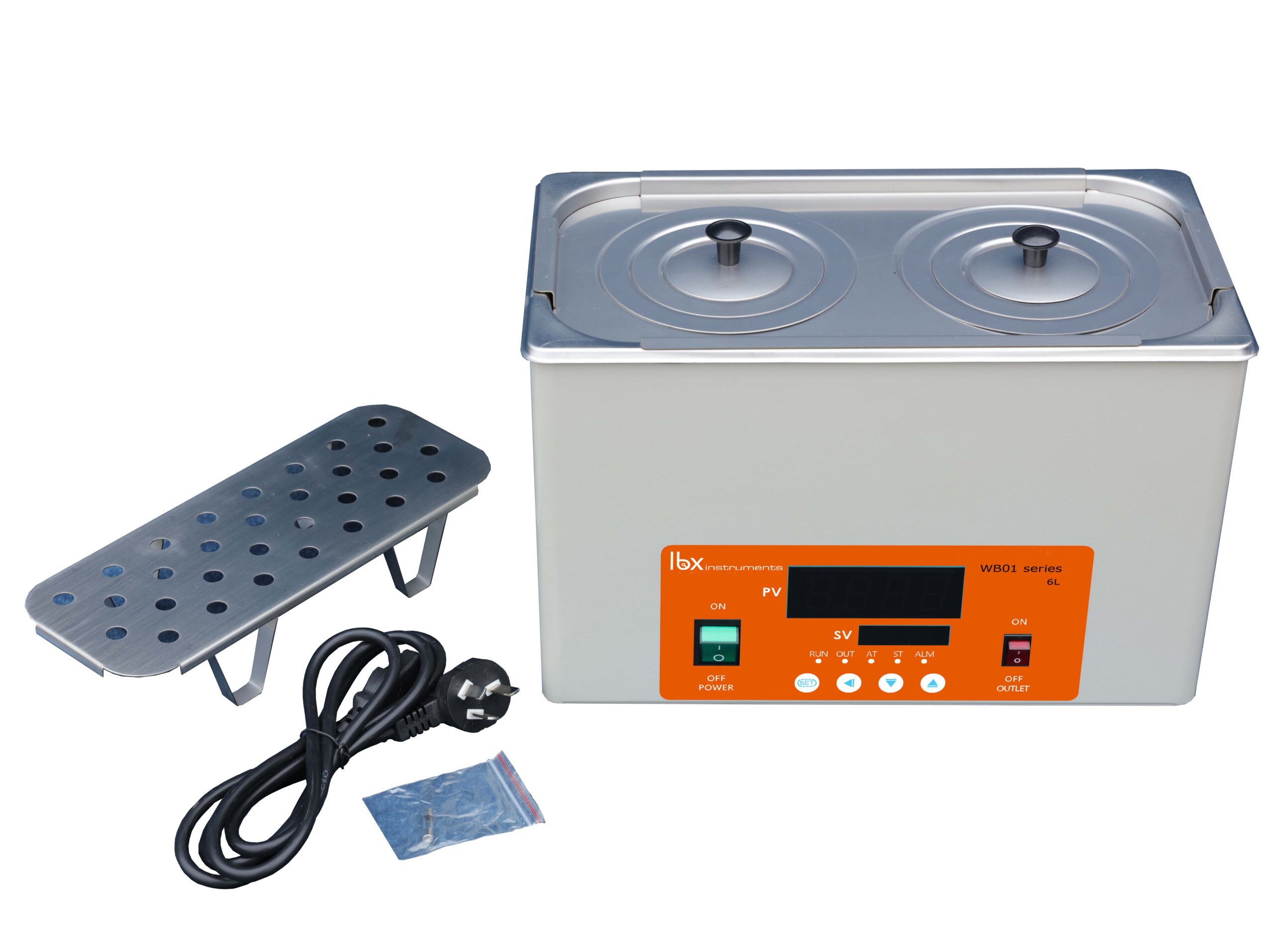 Struttura in metallo con esterno in vernice epossidica con trattamento antiossidante e vasca in acciaio inox 304. Regolazione digitale della temperatura da ambiente +5 °C a 100 °C (risoluzione: 1 °C). Può funzionare in modalità continua oppure essere programmato tramite timer digitale per entrare in funzione in un momento preciso, da 1 a 9999 minuti, con segnale acustico. Doppio display digitale per temperatura e tempo. Allarme di surriscaldamento del bagno. Include piattaforma forata, coperchio rimovibile con fori (11 cm) e anelli riduttori (8 e 5 cm). Dotato di rubinetto di drenaggio (ad eccezione del modello TWBA-001-001). Riempire con acqua purificata e una piccola quantità di acqua del rubinetto per garantire la conducibilità. 220 V / 50-60 Hz. Garanzia di 2 anni