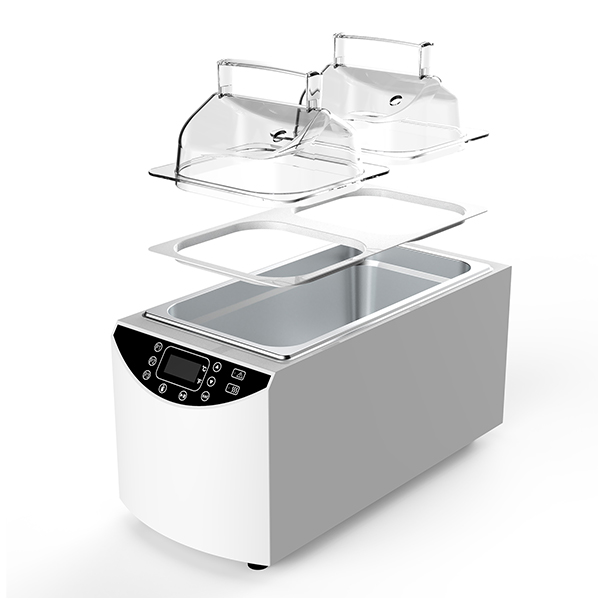 Struttura in acciaio inox e coperchio trasparente. Regolazione digitale della temperatura da ambiente + 5 °C a 99 °C (risoluzione: 0,1 °C). Precisione della temperatura 0,5 °C. Modalità continua o periodi programmati con segnale acustico alla fine del tempo selezionato (memorizza tre preselezioni di temperatura). Timer da 1 min. fino a 999 min. Display LED della temperatura e del tempo, tasti facili da usare. Funzione di protezione contro la marcia a secco per una maggiore sicurezza. Spegnimento automatico e allarme di surriscaldamento. 200-240 V, 50/60 Hz. Garanzia di 2 anni