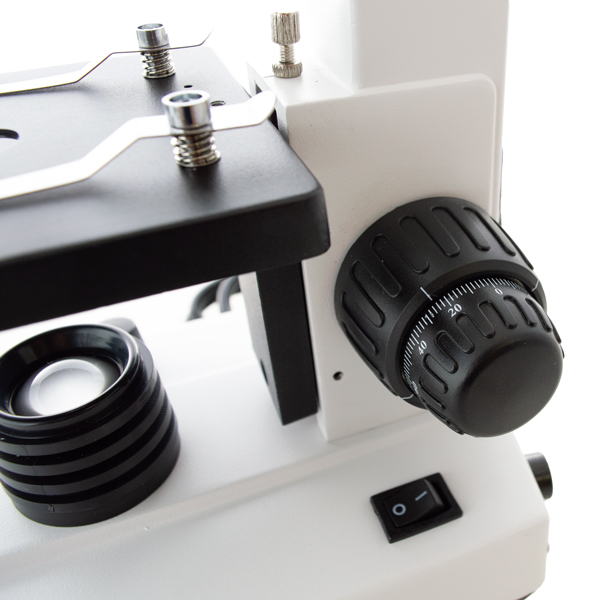Microscopio monoculare con struttura in metallo resistente e finitura antimacchia. Testa inclinata a 45° e rotabile a 360°, oculari WF10X/18 mm, e revolver triplo con obiettivi acromatici DIN 4X, 10X e 40X. Tavolino 110 x 120 mm con fermagli, messa a fuoco coassiale fine e grossolana, condensatore N.A. 0.65 con diaframma a iride, e illuminazione LED regolabile. Include adattatore AC/DC, custodia, fusibile, filtri blu e verde, e maniglia per il trasporto. Garanzia 2 anni