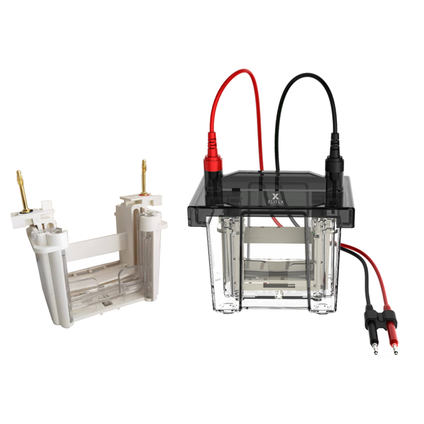 Progettato per elettroforesi verticale di piccole quantità di campioni di acidi nucleici o proteine. Realizzato in un unico pezzo con guarnizione in silicone. Consente la corsa simultanea di due gel da 8,3 x 7,3 cm. Include funzione di spegnimento automatico quando si rimuove il coperchio e connettori di sicurezza per prevenire errori di polarità. Elettrodi in platino ad alta purezza (99,99%) per massima conducibilità. Compatibile con il sistema di trasferimento Volt T90