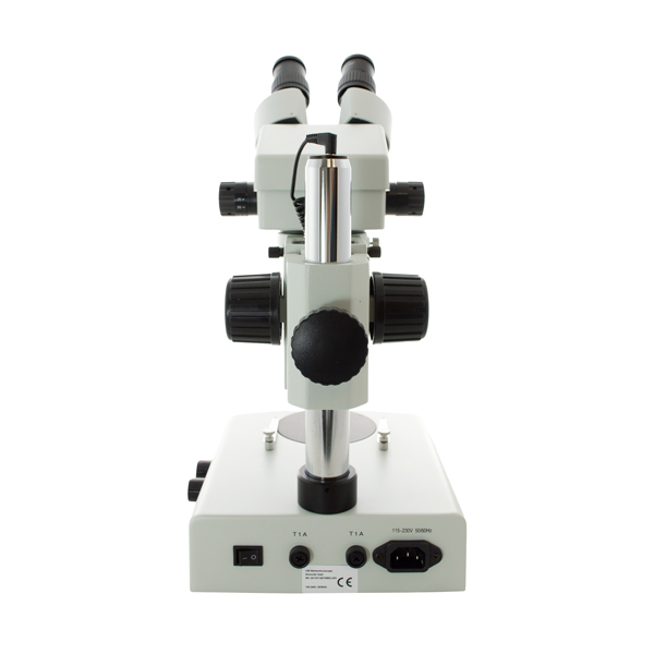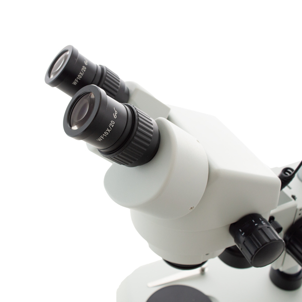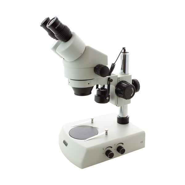 Stereomicroscopio binoculare/trinoculare con sistema ottico tipo Greenough, testa rotante 360° e inclinata di 45°, regolazione diottrica di ±5, rapporto di divisione 50/50, 20/80, 0/100 e distanza interpupillare di 54-76 mm. Oculari WF10X/20 mm e obiettivo zoom continuo 0,7X-4,5X, con ingrandimento standard di 7X-45X (estensibile a 2,1X-270X). Messa a fuoco a cremagliera e pignone. Illuminazione LED regolabile per luce incidente e trasmessa. Base con disco trasparente e clip per campioni. Garanzia 2 anni